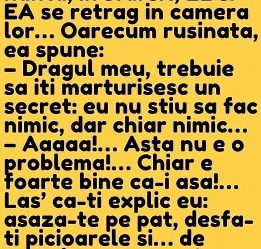 Citeste si...Dupa petrecerea de la nunta, in sfarsit, EL si EA se retrag in camera lor… Oarecum rusinata, ea spune: – Dragul meu, trebuie sa iti