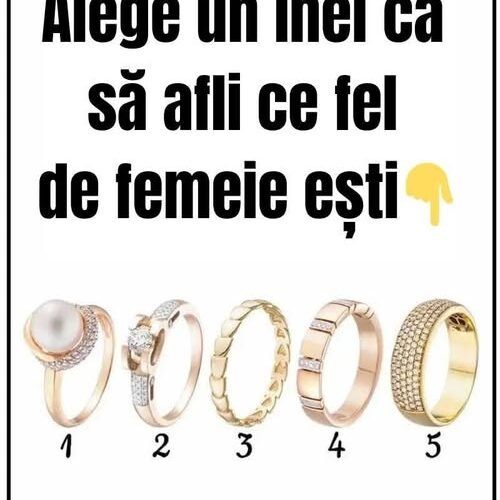 Uitați-vă pentru câteva secunde la cele cinci modele de inele, respirați adânc și notați numărul inelului care vă atrage cel mai mult. Interpretările care urmează nu sunt reguli absolute, ci un exercițiu de autocunoaștere menit să vă ajute să înțelegeți mai bine ce transmite alegerea voastră.